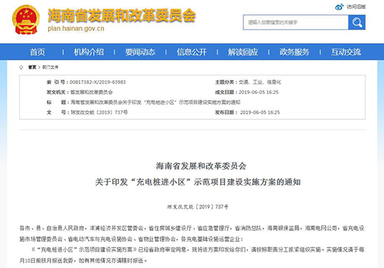 海南省发改委6月5日印发的《“充电桩进小区”示范项目建设实施方案》近日经海南省政府审定同意和实施。上述方案透露,海南省将在海口、三亚、儋州、琼海范围内,每个市县优选出不少于10个示范小区,其他市县(不含三沙市)结合实际情况自行确定示范小区数量,综合考虑小区建桩意愿调查结果,先行按照不低于1:0.3的车位和充电桩比例目标建设充电基础设施。实施时间为2019年6月至2019年10月。