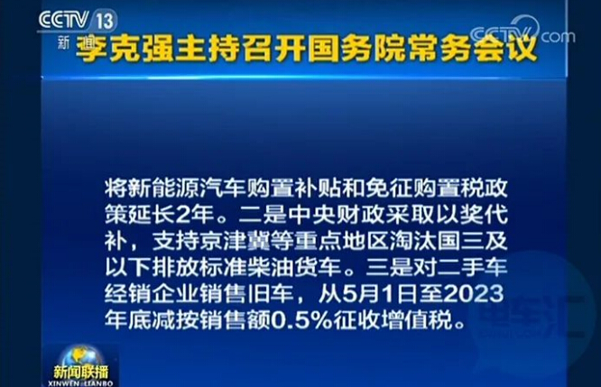 为促进汽车消费,会议确定:一是将年底到期的新能源汽车购置补贴和免征车辆购置税政策延长2年。二是中央财政采取以奖代补方式,支持京津冀等重点地区淘汰国三及以下排放标准柴油货车。三是对二手车经销企业销售旧车,从5月1日至2023年底减按销售额0.5%征收增值税。乘用车方面主要涉及新能源汽车和二手车,前者延长了税收优惠政策,后者则启动了业内呼吁多年的增值税改革。