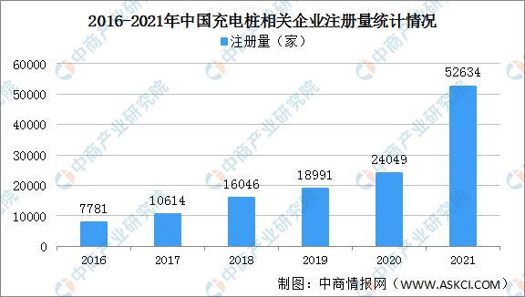 资本看好充电桩领域,这几年与充电桩相关的企业数量呈现出了飞速增长的趋势。2016年我国充电桩相关企业注册量仅7781家,2017年突破1万家,2020年突破2万家达到24049家。2021年科技企业跨界造车,带动充电桩相关企业增加。2021年充电桩相关企业注册量突破5万家达到52634家。