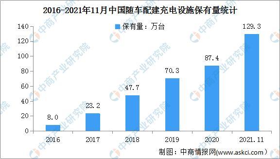 充电桩的发展提速,随车配建充电设备增加。2016年随车配建充电桩保有量不足10万台,2020年突破80万台。2021年1-11月随车配建充电设施增量持续上升,同比上升198.1%,公共充电基础设施增量同比上涨59.1%。截止2021年11月,随车配建充电桩129.3万台。