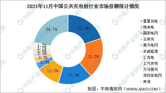 我国充电桩行业头部企业优势显著。数据显示,截止到2021年11月,全国公共充电桩运营商CR10为75.3%,其中,星星充电、特来电、国家电网市场份额分别为22.5%、21.5%、17.9%,这三家企业市场份额累计62.0%。云快充市场份额12.5%。南方电网、依威能源、汇充电、上汽安悦、万马爱充、深圳车电网市场份额不足5%。