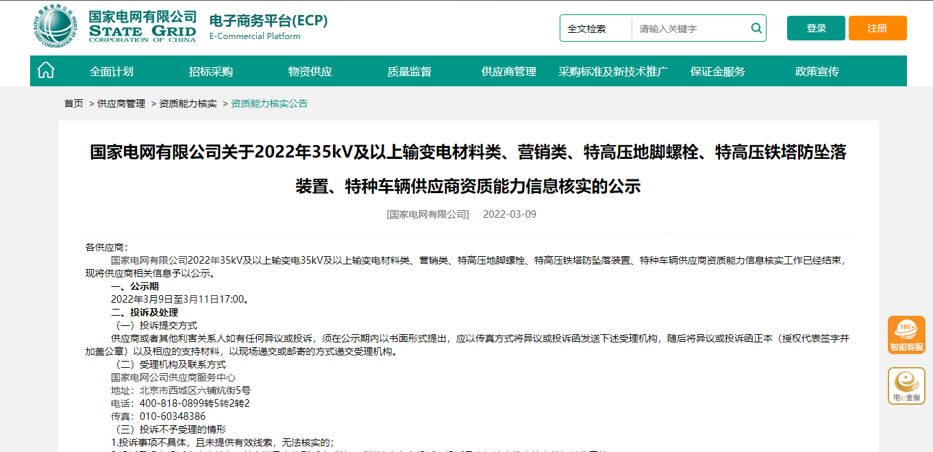 昨日,国家电网电子商务平台发布了《国家电网有限公司关于2022年35kV及以上输变电材料类、营销类、特高压地脚螺栓、特高压铁塔防坠落装置、特种车辆供应商资质能力信息核实的公示》
